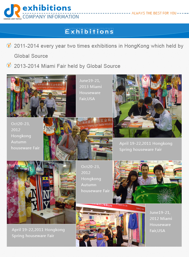 我们生产各种浴衣,浴室防滑垫,手巾,脸 毛巾,头发的毛巾,毛毯,床垫,游泳池毛巾,床单,枕套。